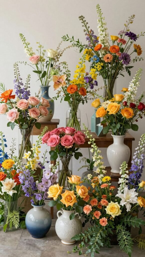 Ditch the rigid rose arrangements and let nature do its thing. Embrace the beautiful chaos of a wildflower wonderland. Think mismatched vases, varying heights, and a riot of colors that feel like they were just picked from a meadow. Integrate touches of dried grasses and leafy eucalyptus sprigs for that effortlessly cool, bohemian vibe.