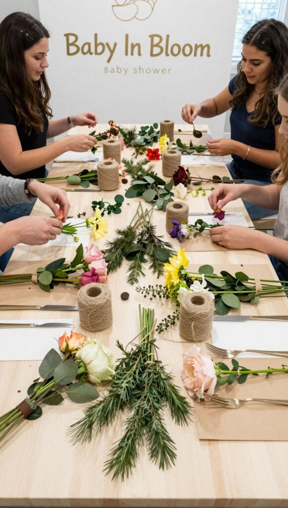 Pro tip: Have a few example arrangements on display to inspire your less-creative pals. Offer cute “Take Your Bloom” tags for them to personalize. It’s an interactive and engaging activity that doubles as a lovely take-home gift, keeping spirits high and hands busy.