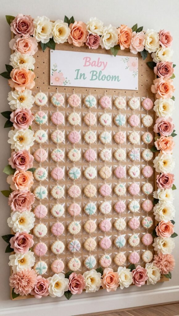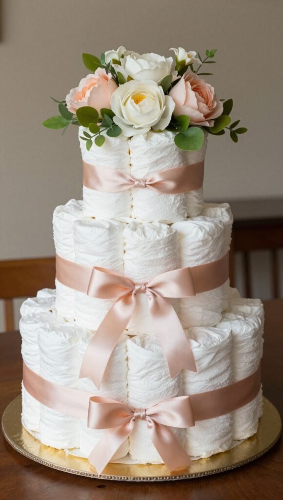 The classic baby shower staple, reimagined with a “Baby In Bloom” twist. Instead of just ribbons and baby toys, adorn your diaper cake with beautiful silk flowers, delicate greenery, and perhaps a tiny wooden “baby” sign tucked in. It elevates a practical gift into a stunning centerpiece.
