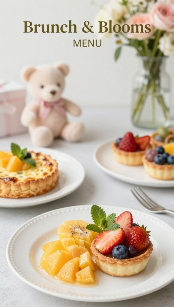 Pro tip: Label your food items with charming, handwritten tags like “Garden Greens Salad” or “Sunrise Fruit Medley.” And yes, tiny floral-themed cupcakes are non-negotiable. Brunch is a universally loved meal, and lighter fare perfectly complements the fresh, airy aesthetic of an “in bloom” shower.