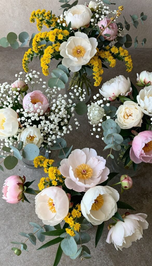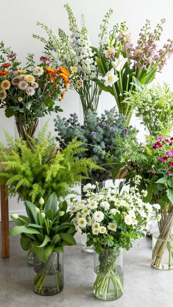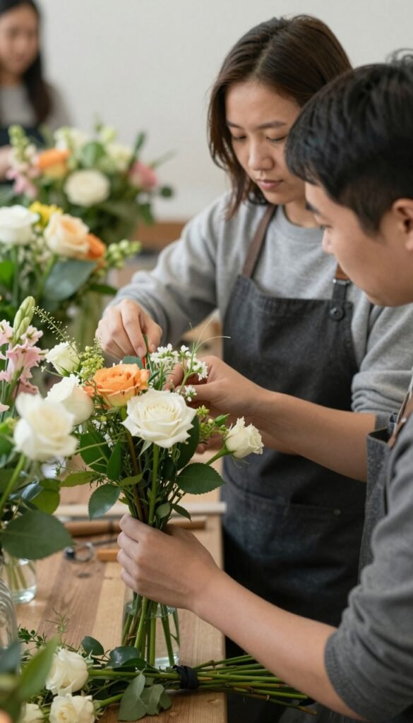 This is where the magic happens. You need a mix of stars: focal flowers (hello, peonies), filler flowers (baby’s breath, solidago), and greenery (eucalyptus, ruscus). Aim for variety in shape, size, and texture to give everyone creative freedom. Buying in bulk from a local market or wholesaler often saves major cash. Make sure you have enough of each type so nobody feels like they’re scraping the bottom of the barrel.