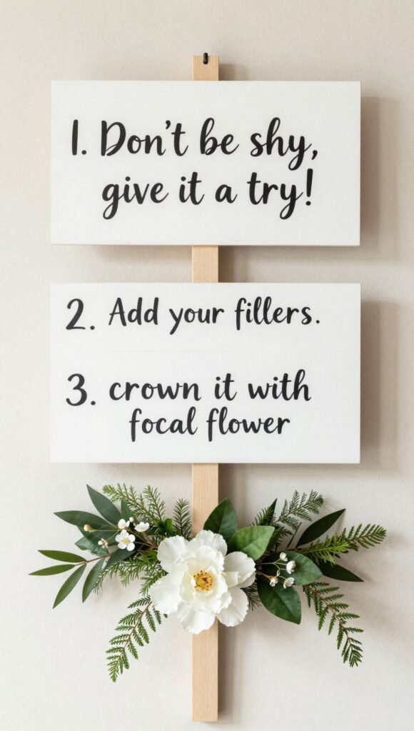 Guide your guests with a little flair. Create cute, easy-to-read signs explaining the process: “1. Pick your greenery. 2. Add your fillers. 3. Crown it with a focal flower.” A cheeky sign like “Don’t be shy, give it a try!” encourages participation. Clear instructions save you from answering the same questions repeatedly.
