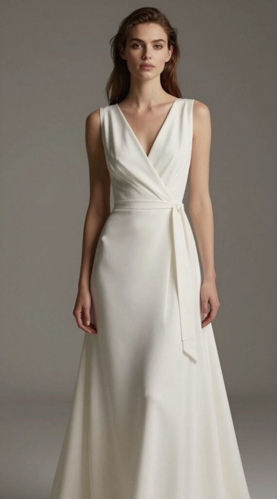 Opt for a luxurious fabric like silk or a weighty crepe for a more formal feel. This dress adapts beautifully to almost any wedding setting, from casual backyard affairs to swanky ballroom receptions.