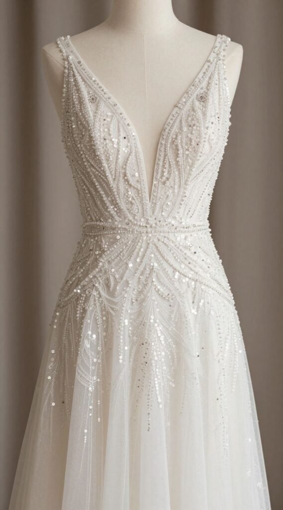 Remember, the goal is sparkle, not disco ball. This dress is made for evening celebrations and hitting the dance floor, allowing you to shine without upstaging the main event.