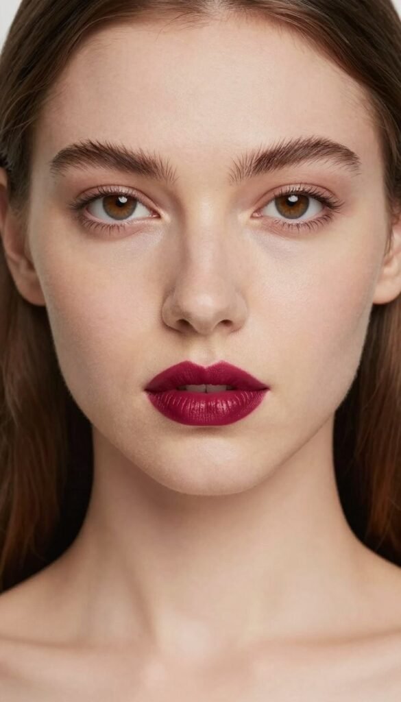 This look is incredibly chic and modern, highlighting your lips while letting your brown eyes maintain a soft, inviting allure.