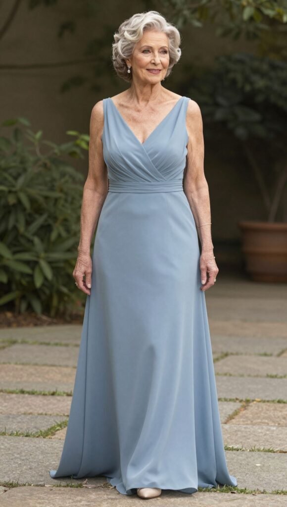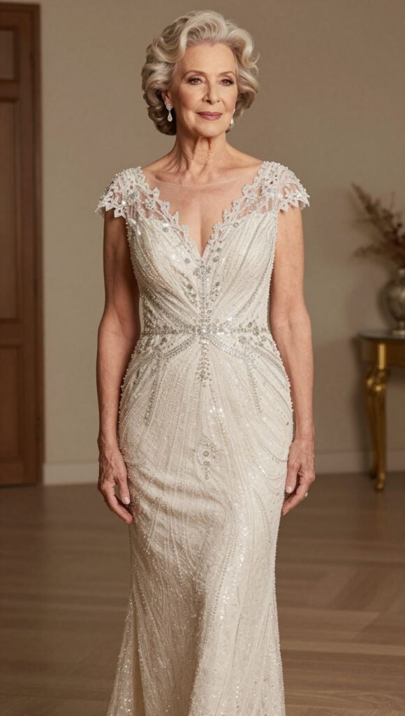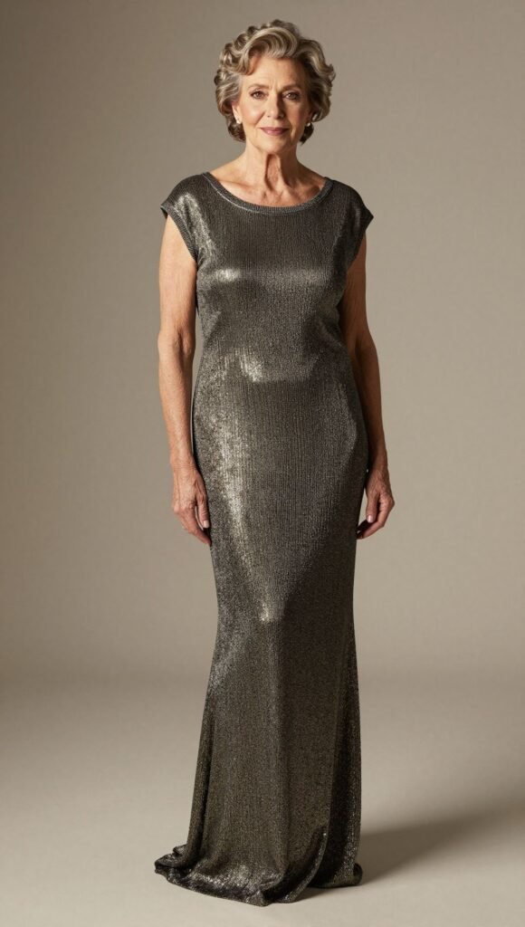 It offers stretch and ease, making it perfect for dancing, while still looking incredibly chic and celebratory. This gown is ideal for the grandmother who wants to shine effortlessly.
