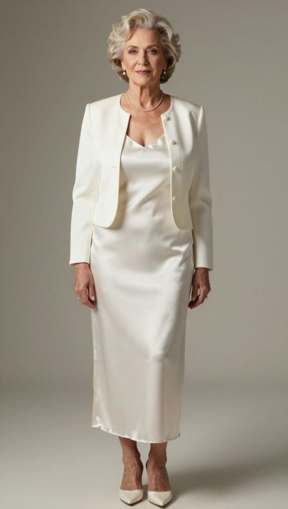 For understated luxury, consider a sleek satin slip dress paired with a matching or contrasting structured jacket or bolero. The slip dress provides a slinky, sophisticated base, while the jacket offers coverage and warmth.