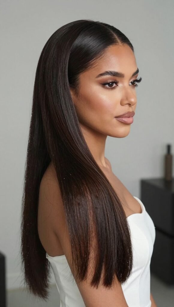 Who said straight hair can’t be a showstopper? A super sleek, glossy straight style is modern, sophisticated, and seriously chic. It gives off major “I’m in charge here, but also celebrating” vibes.