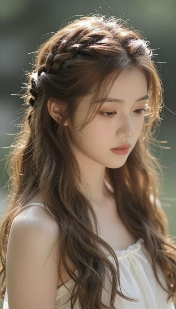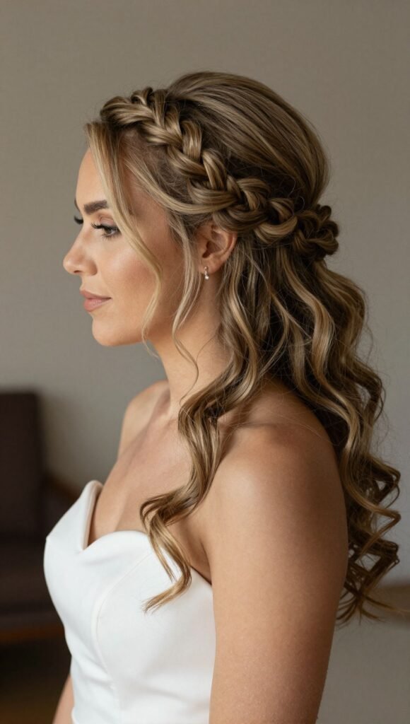 Another “mostly down” look that adds an angelic touch. A delicate braid wraps around your crown, with the rest of your hair flowing freely. It’s ethereal and adds a touch of whimsical charm.