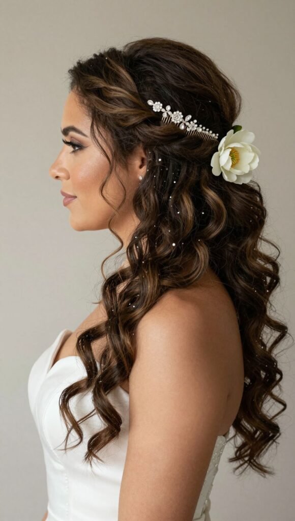 Choose an accessory that complements your outfit and the wedding’s theme. Place the accessory strategically where it will catch the light without overpowering your face. This look is fantastic because it adds a touch of personalized glamour without requiring a complex hairstyle.
