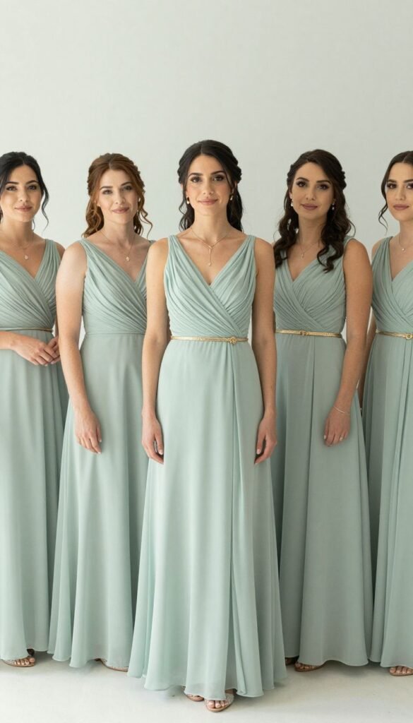 This keeps the focus on the beautiful sage while providing that necessary pop of glam. You can even have the maid of honor wear a slightly different shade of green or a gown with more gold embellishment for a subtle standout moment. Make sure everyone feels comfortable and confident in their choices; happy bridesmaids make for amazing photos!
