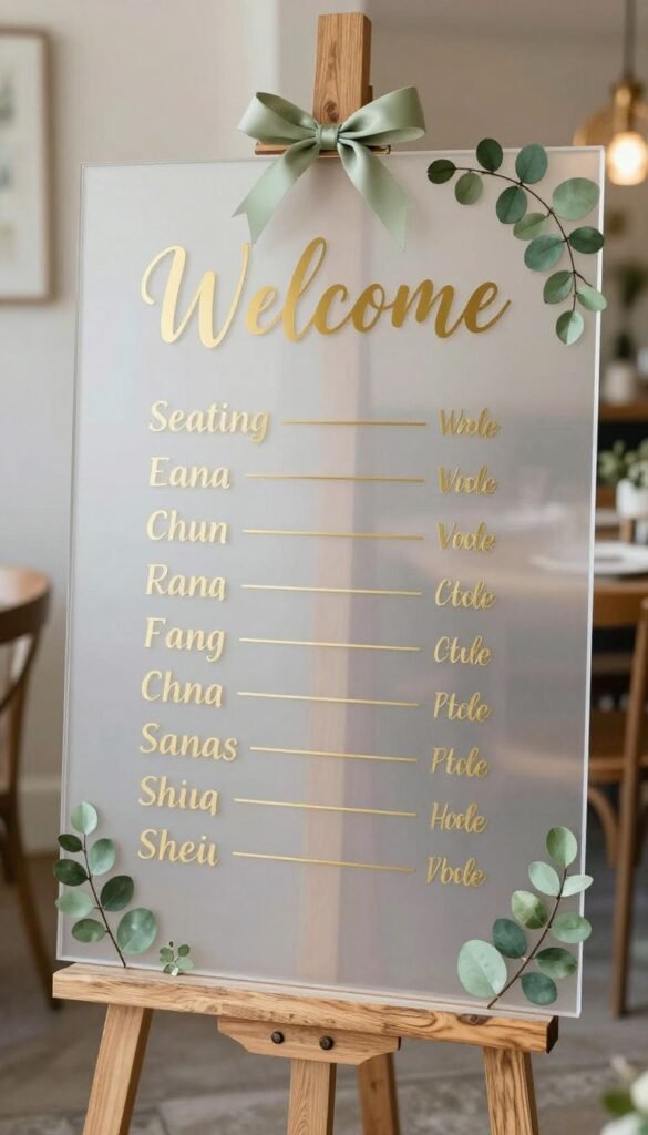 From your welcome sign to the seating chart, signage is a fantastic opportunity to reinforce your theme. Use clear acrylic signs with gold calligraphy and sage green botanical accents. Wooden signs with gold lettering and a sage green ribbon are also incredibly charming.