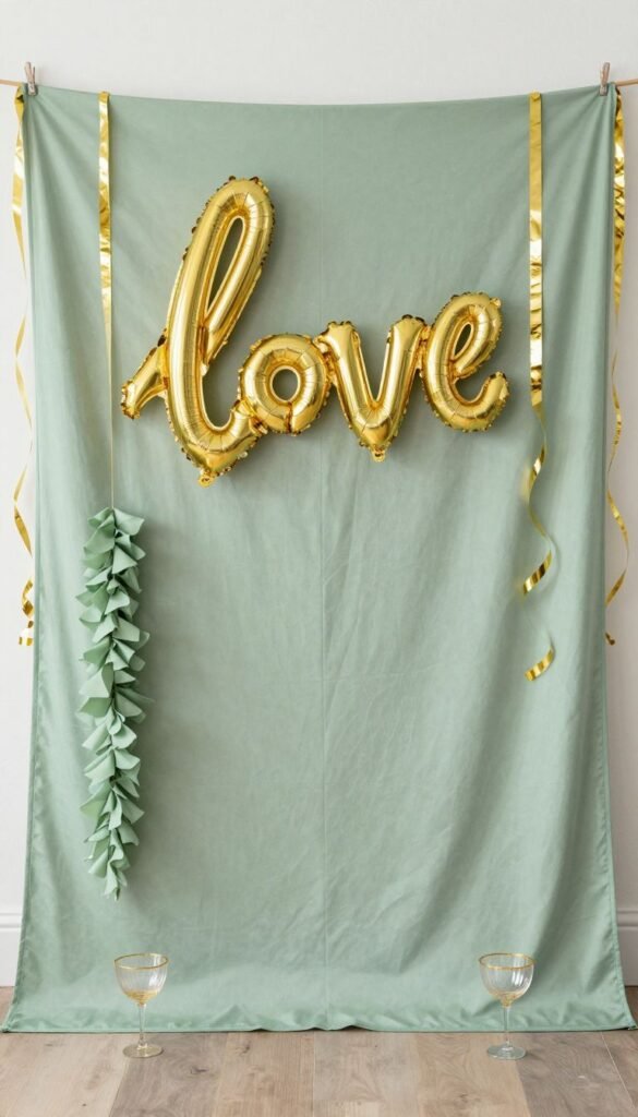 Give your guests a fun, themed spot to capture memories. A simple sage green fabric backdrop adorned with gold streamers, balloons, or a custom gold foil “Love” sign works wonders. Provide props like gold-rimmed glasses, sage green boas, or even small faux succulent arrangements.