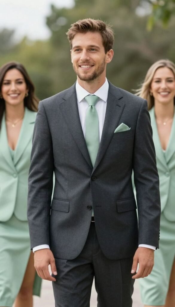 Don’t let the ladies have all the fun! The groom and his crew can absolutely nail this theme too. A classic charcoal or navy suit gets an instant upgrade with a sage green tie or pocket square.