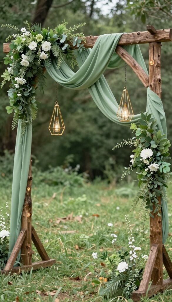 The “I do” spot needs to be absolutely breathtaking, and this theme delivers. Imagine a rustic wooden arch draped with flowing sage green fabric and lush greenery, interspersed with touches of gold, perhaps from geometric lanterns or delicate fairy lights.