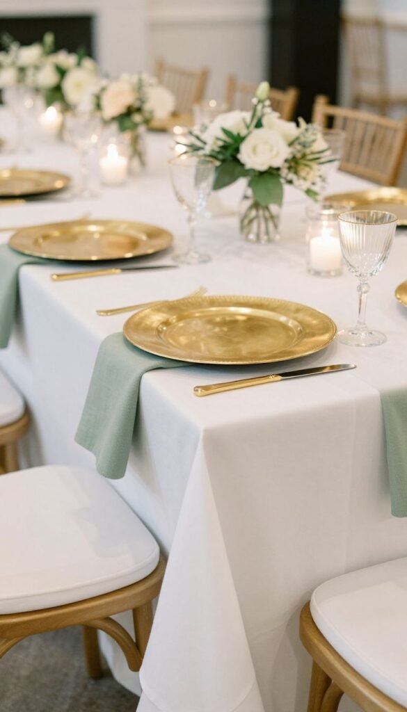 This is where the magic truly happens for your reception. Start with crisp white or ivory linens, then layer on sage green runners or napkins. Introduce gold charger plates, elegant gold flatware, and perhaps even gold-rimmed glassware.