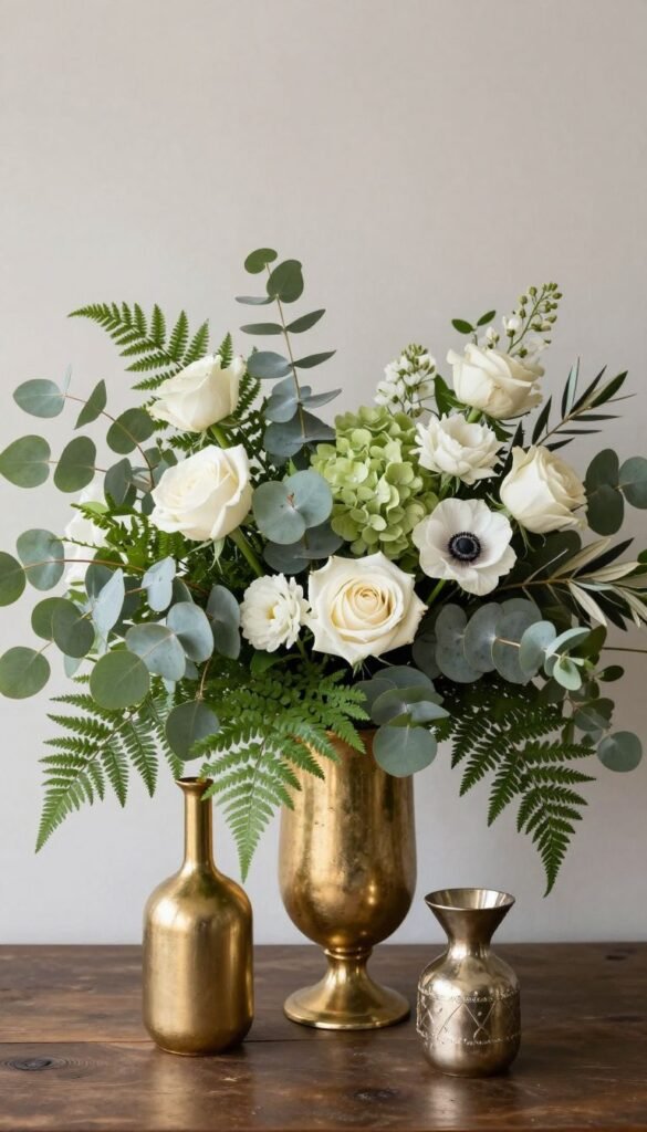 Greenery is your best friend here, obviously. Think eucalyptus, olive branches, and fern, all in their natural sage-y glory. Mix in white or cream roses, anemones, or hydrangeas for contrast.