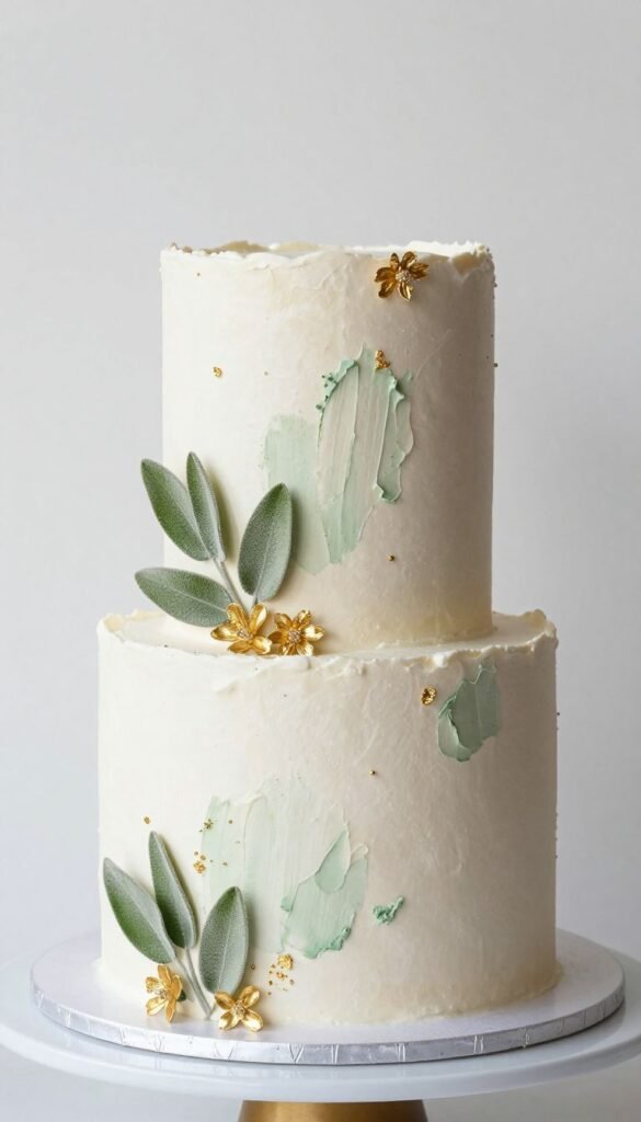 Your cake is a work of art, so let it shine! A simple white or ivory fondant cake provides the perfect canvas. Adorn it with delicate sage green brushstrokes, edible gold leaf accents, or even a cascade of real sage greenery and gold sugar flowers.