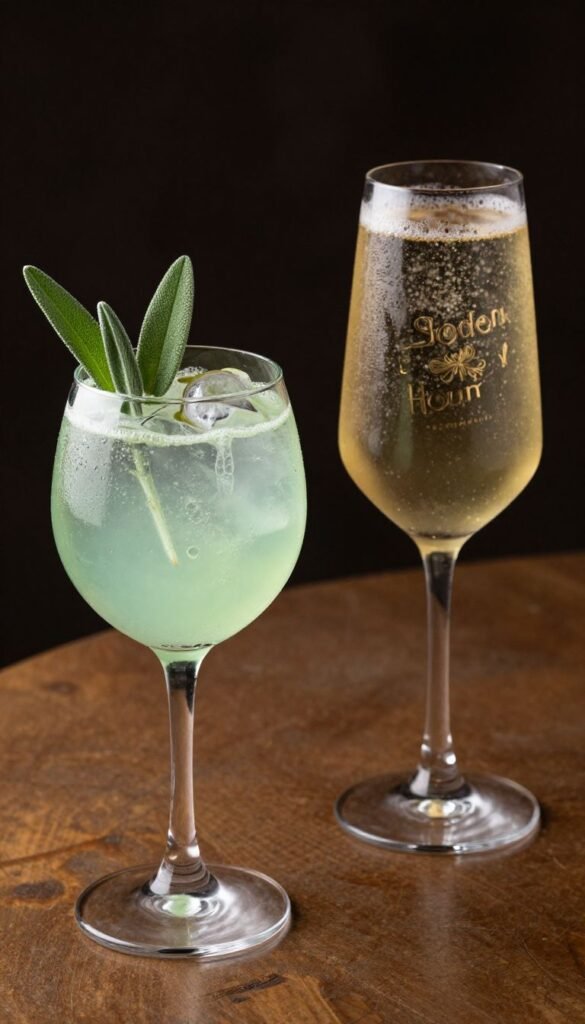 Cocktail hour just got an upgrade. Craft two signature cocktails: one leaning into the green, one into the gold. Think a “Sage Garden Gin Fizz” with fresh sage leaves and lime, and a “Golden Hour Sparkler” with prosecco and a hint of elderflower liqueur.
