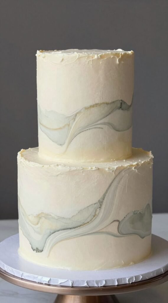 Your cake just got a serious upgrade to high-art status. This design features a smooth fondant or buttercream cake with a beautiful marbled effect in two or three soft, complementary colors. Think sophisticated stone or flowing watercolors.
