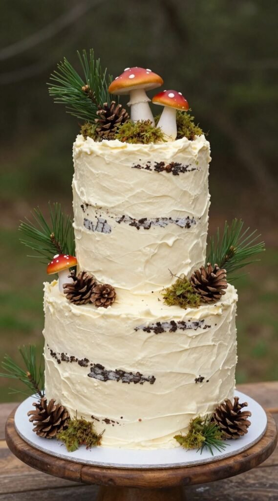 Channeling your inner fairy tale, are we? This rustic design features a perhaps semi-naked or bark-textured buttercream cake, adorned with elements like small branches, pinecones, or edible moss (yes, really!).