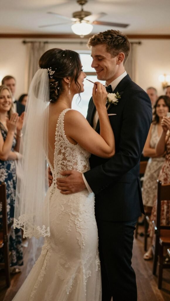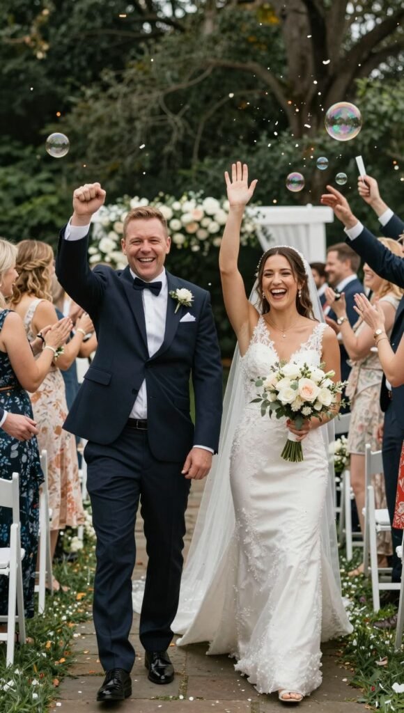 You’re officially hitched! The pure, unadulterated joy of walking back up the aisle as a married couple is contagious. Think big smiles, high-fives, and maybe even a celebratory fist pump. Throw in some confetti or bubbles for extra flair.