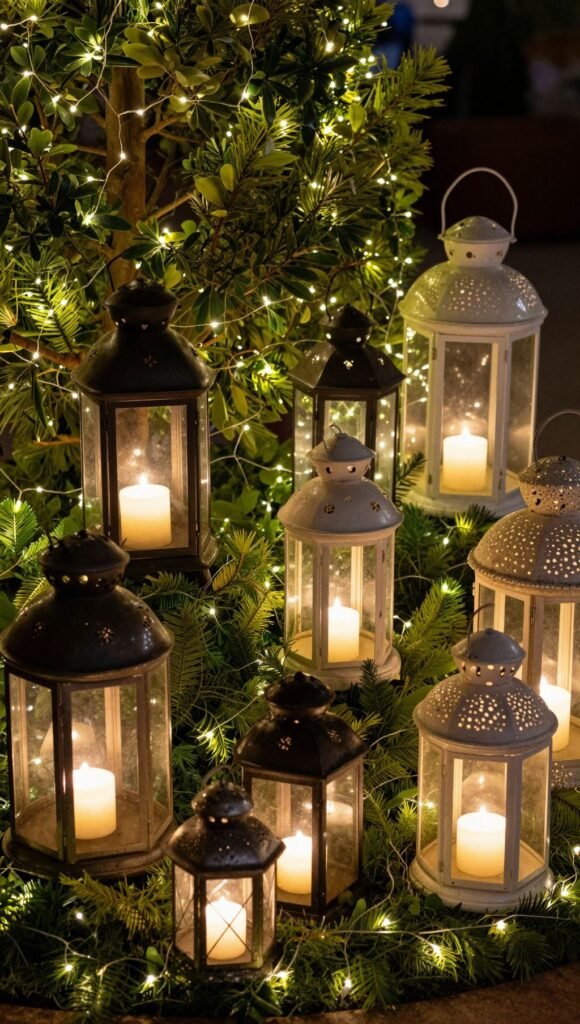 For an enchanting, whimsical vibe, incorporate decorative lanterns of various sizes and nestle strings of fairy lights among them or within your greenery. It creates a soft, magical glow that feels incredibly inviting.