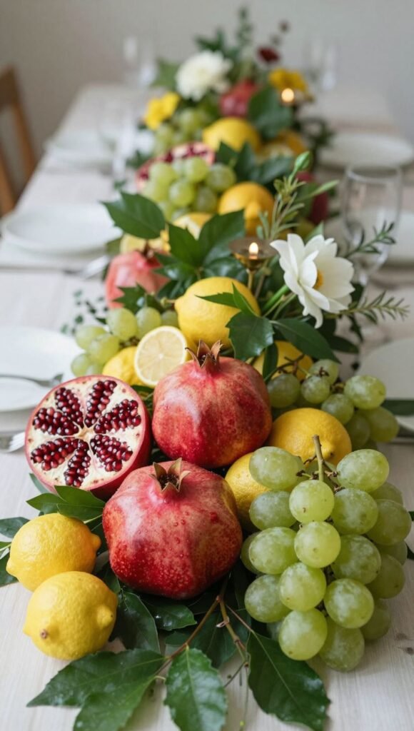 Who says decor can’t be delicious? Incorporate fresh fruits like vibrant pomegranates, lemons, or grapes alongside lush greenery and a few choice blooms. It adds color, texture, and an unexpected sensory element to your tables.