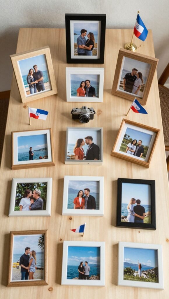 Make each table feel special by creating small, personalized vignettes that reflect your journey as a couple or your shared interests. Think framed photos, small mementos, or even tiny flags representing places you’ve traveled.