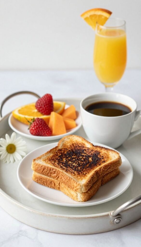 Forget burnt toast. We’re talking fresh pastries, perfectly brewed coffee, a side of fruit, and maybe even a mimosa. Serve it on a cute tray with a small flower.